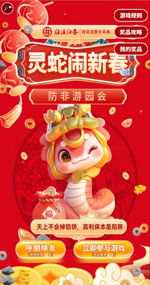 海通证券推出“灵蛇闹新春 防非游园会”线上游戏,在游戏中巧妙融入防非知识,更深刻地传达防非意识的重要性,提醒投资者时刻保持警惕,将防非理念融入日常生活和投资决策中。