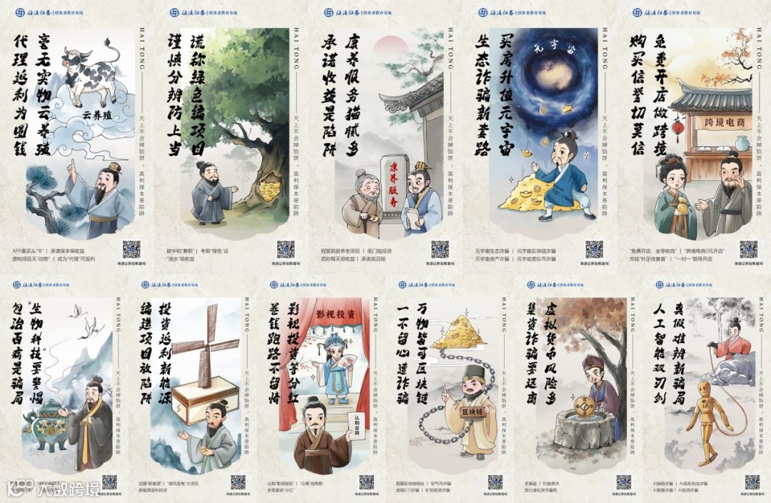 海通证券将中华传统文化融入防非宣传,通过年兽、国风画等特色元素,精心制作《年兽遇上反诈天团》《岁末年初防非国风创意海报》等一系列防非投教作品。该系列作品聚焦养老、投融资、涉农、市场零售、文旅、黄金托管等非法集资案件高发领域,使得防非作品更具“年味”,帮助投资者树立防范非法证券活动的意识,提升自身防非能力。