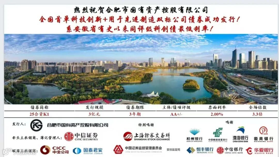 近日,国泰君安助力合肥市国有资产控股有限公司(简称“合肥国控”)在上交所成功发行全国首单用于先进制造的科技创新公司债券,发行规模3亿元,期限为3年期,票面利率2.00%。