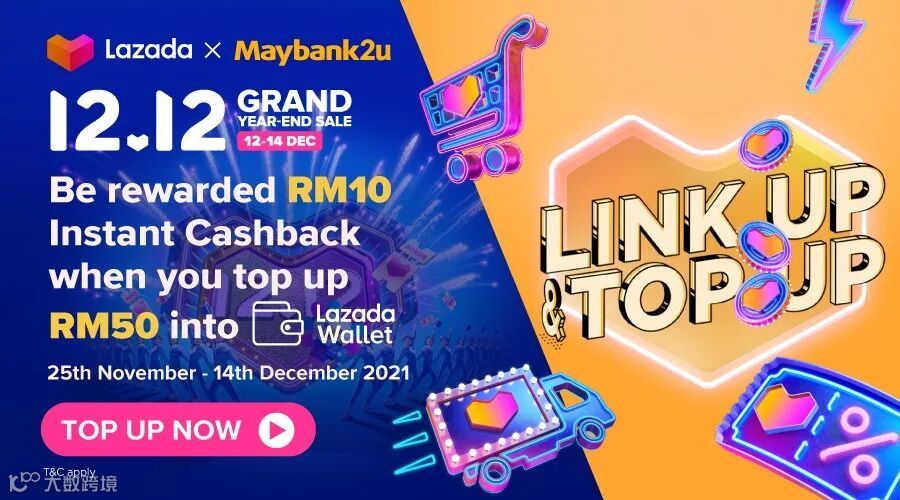 Open your Lazada app > ‘Account’ > ‘Top Up’ under Lazada Wallet > top up min. RM50 > Link Maybank2u Bank Account > Confirm > RM10 cashback will be credited into your Lazada Wallet!