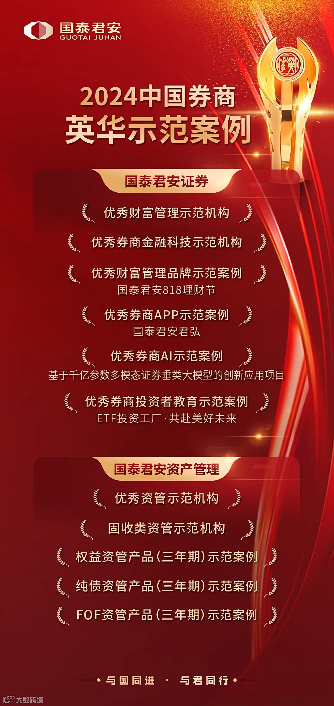 9月25日,由《中国基金报》主办的2024中国券商英华示范案例评选结果正式公布。凭借卓越的服务能力与优秀的市场表现,国泰君安荣获优秀财富管理示范机构、优秀券商金融科技示范机构、优秀财富管理品牌示范案例、优秀券商APP示范案例、优秀券商AI示范案例、优秀券商投资者教育示范案例6项大奖,子公司国泰君安资产管理荣获优秀资管示范机构、固收类资管示范机构、权益资管产品(三年期)示范案例、纯债资管产品(三年期)示范案例、FOF资管产品(三年期)示范案例5项大奖。