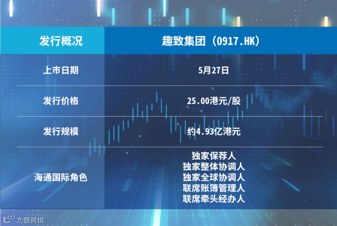 5月27日,海通国际独家保荐趣致集团(股票代号:0917.HK)完成首次公开发行,在此项目中,海通国际担任独家保荐人、独家整体协调人、独家全球协调人、联席账簿管理人及联席牵头经办人。