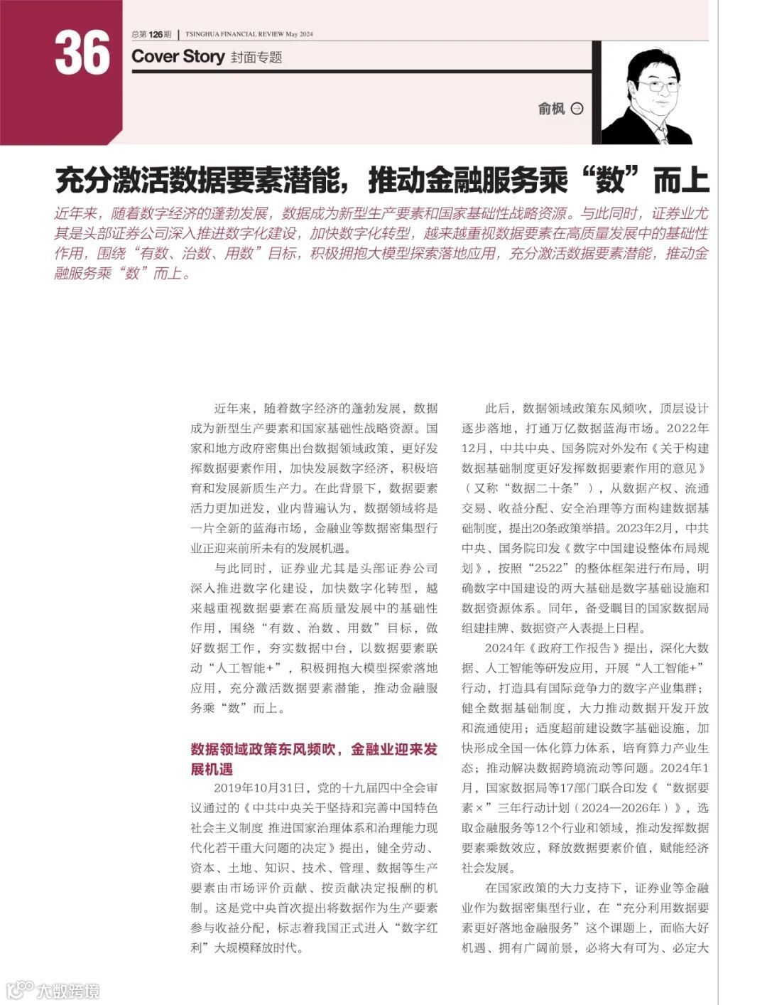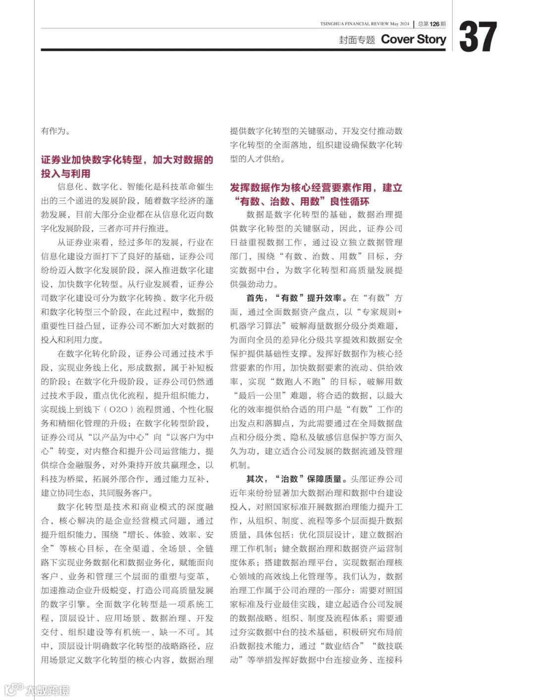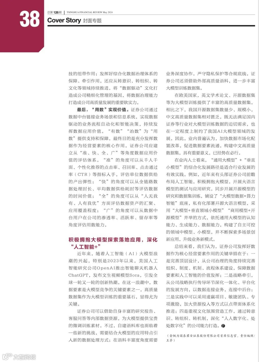 导语:近年来,随着数字经济的蓬勃发展,数据成为新型生产要素和国家基础性战略资源。与此同时,证券业尤其是头部证券公司深入推进数字化建设,加快数字化转型,越来越重视数据要素在高质量发展中的基础性作用,围绕“有数、治数、用数”目标,积极拥抱大模型探索落地应用,充分激活数据要素潜能,推动金融服务乘“数”而上。