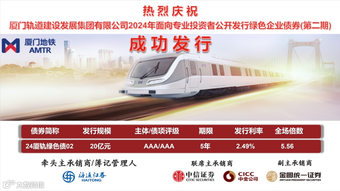 近日,海通证券作为牵头主承销商助力厦门轨道建设发展集团有限公司(以下简称厦门轨道集团)成功发行2024年面向专业投资者公开发行绿色企业债券(第二期)。本期债券发行规模20亿元,期限5年,发行利率2.49%,募集资金将用于补充企业营运资金及建设轨道交通项目。本期债券的成功发行将为厦门市轨道交通建设注入资金“活水”,为厦门市绿色发展、落实低碳省市试点工作再添一抹“新绿”。