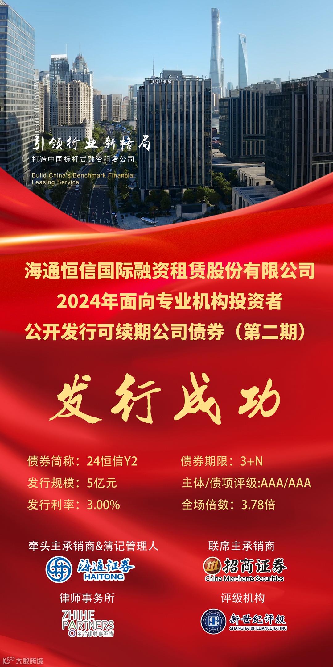 近日,海通证券作为牵头主承销商,助力子公司海通恒信国际融资租赁股份有限公司(以下简称海通恒信)在上海证券交易所成功发行2024年面向专业机构投资者公开发行可续期公司债券(第二期),发行规模5亿元,期限3+N年,票面利率3.00%,全场倍数3.78倍,体现出资本市场对海通恒信的广泛关注和大力支持。
