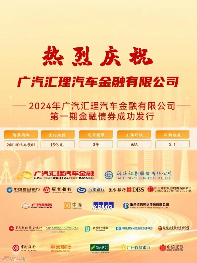 近日,海通证券作为主承销商,助力广汽汇理汽车金融有限公司(以下简称广汽汇理汽金)成功发行企业首单“债券通”金融债券——2024年广汽汇理汽车金融有限公司第一期金融债券,发行规模15亿元,期限3年,发行利率2.48%,全场认购倍数3.1倍,体现了债券市场对广汽汇理汽金经营实力和资产质量的高度认可。