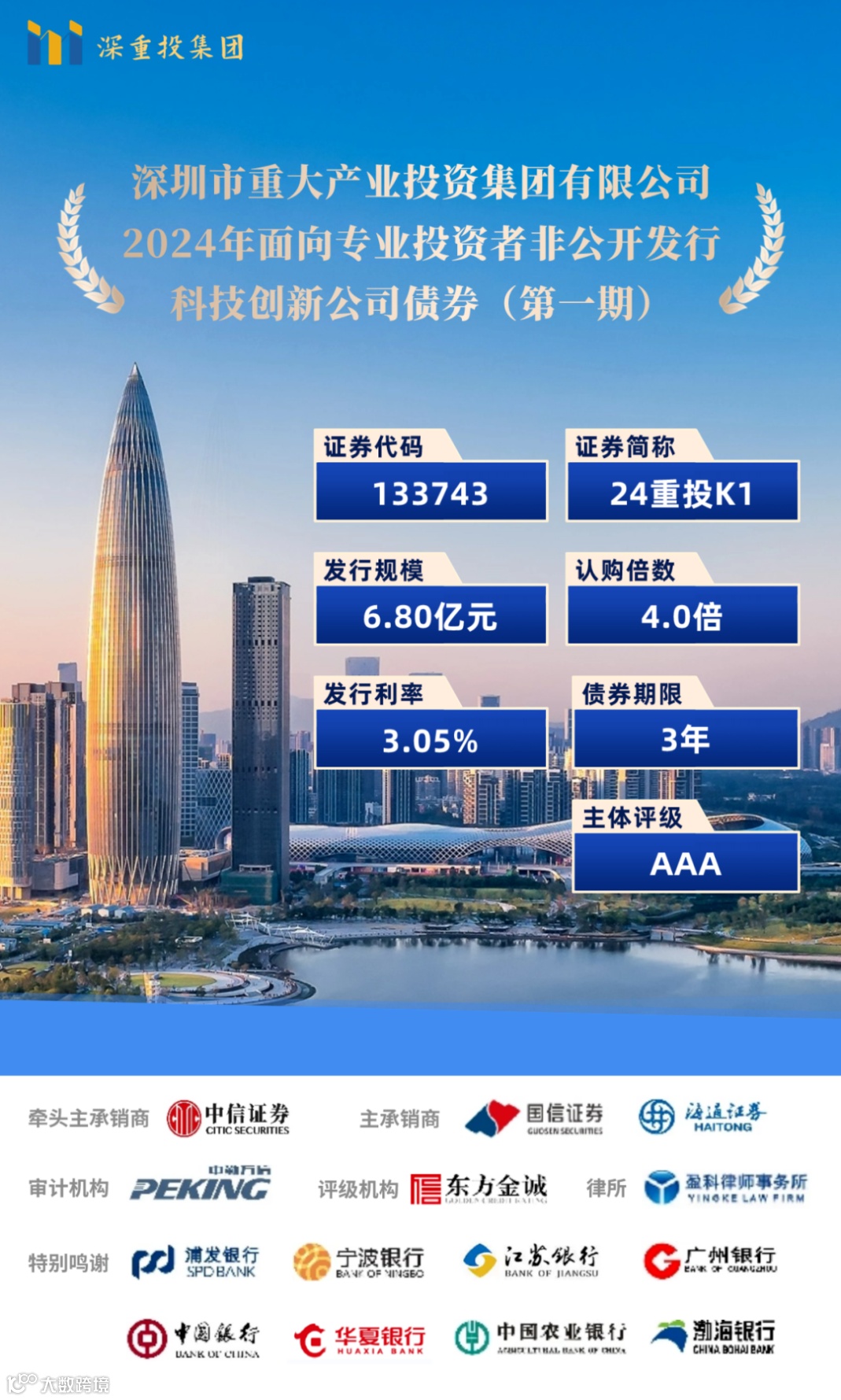 近日,海通证券作为主承销商,助力深圳市重大产业投资集团有限公司(以下简称深重投集团)成功发行2024年面向专业投资者非公开发行科技创新公司债券(第一期)。本期债券发行规模6.8亿元,期限3年,票面利率3.05%,募集资金扣除发行费用后,将用于股权投资、补充流动资金等法律法规允许的用途,其中股权投资比例不低于本期债券规模的70%。