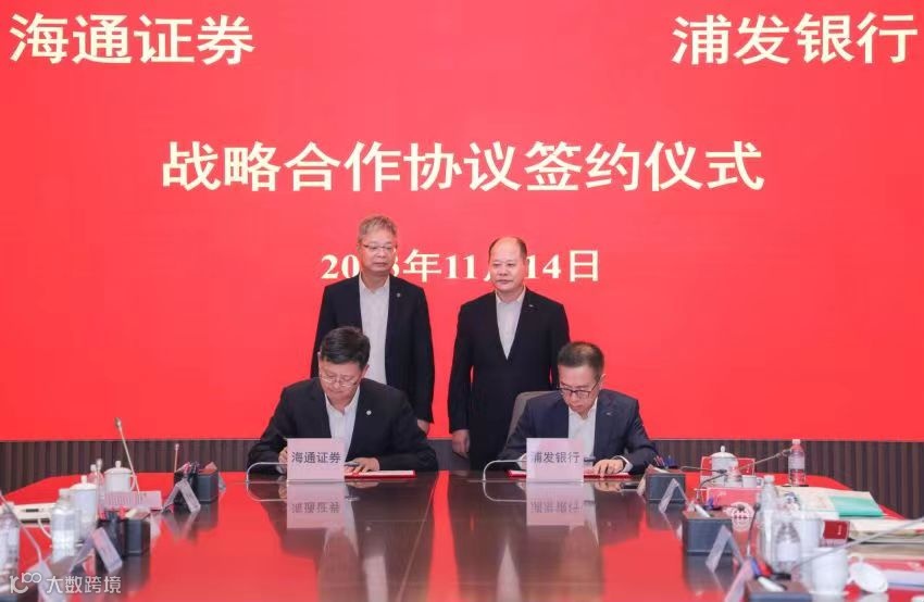 11月14日下午,海通证券与上海浦东发展银行股份有限公司(以下简称浦发银行)举行战略合作协议签约仪式。海通证券党委书记、董事长周杰,党委副书记、总经理李军,副总经理潘光韬,副总经理、财务总监张信军;浦发银行党委书记张为忠,党委副书记、副行长刘以研,副行长谢伟,行领导康杰等出席签约仪式并座谈交流。