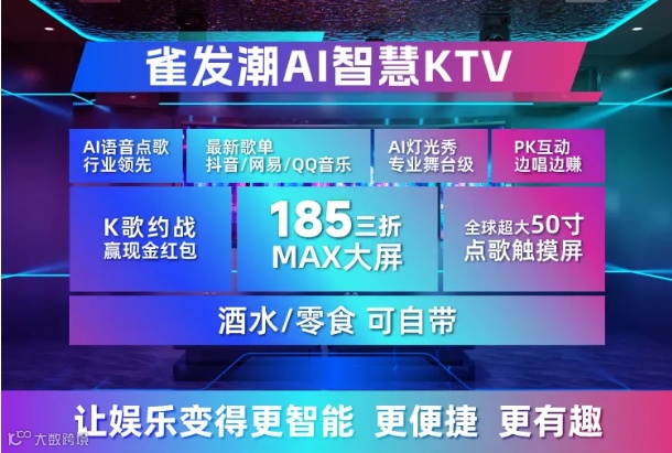 雀发潮185寸三折MAX大屏,巨幕狂欢,包厢秒变演唱会现场!行业首创,4K超清巨幕,带来极致视觉盛宴;高强度防爆屏,安全无忧。智能音频律动,沉浸式体验,仿佛身临其境。一屏多用,K歌、观影、门店活动上屏营销全满足。雀发潮AI智慧KTV,引领多联屏沉浸式娱乐新体验。