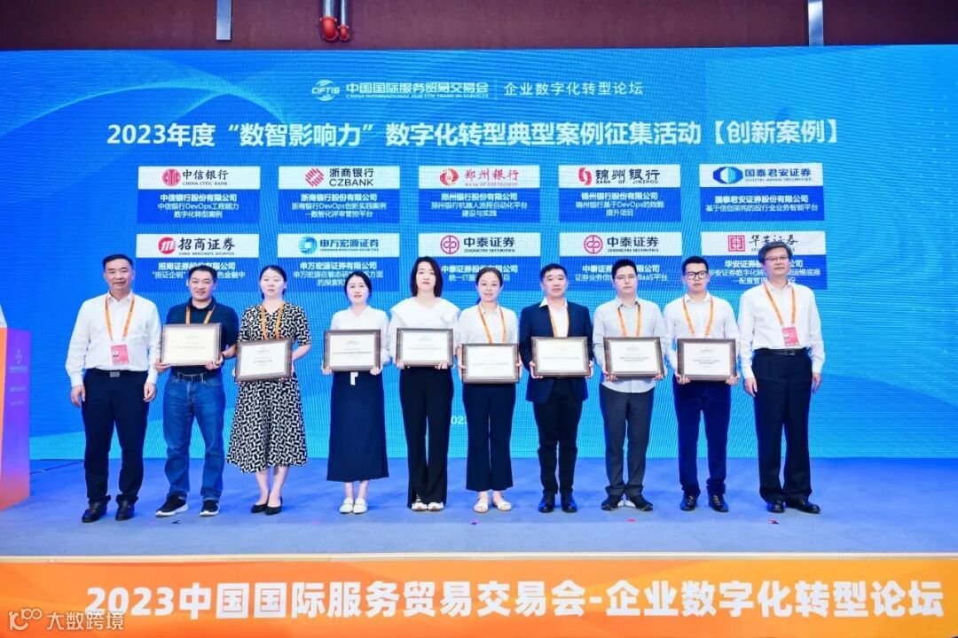 9月2日至6日,2023中国国际服务贸易交易会在北京成功举办。活动期间,由工业和信息化部新闻宣传中心与中国信息通信研究院联合主办的“企业数字化转型论坛”顺利举行。会上宣布了2023年度“数智影响力”数字化转型典型案例征集活动评选结果,国泰君安成为唯一一家被授予“领军企业”称号的证券公司,并凭借《基于信创架构的投行全业务智能平台》项目获得“创新案例”奖项,是唯一一家同时获得2项荣誉的证券公司。