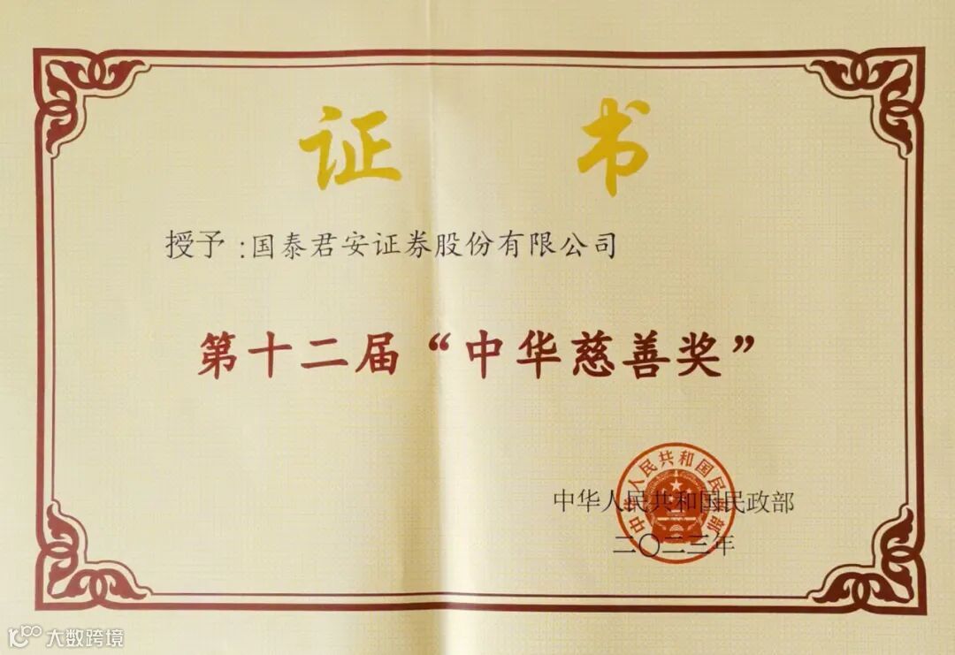 9月5日是第八个“中华慈善日”,第十二届中华慈善奖颁奖典礼在北京人民大会堂隆重举行,国泰君安荣获“中华慈善奖”捐赠企业奖,这也是继第一届上海慈善奖后国泰君安获得的又一项殊荣。在37家获奖企业中,国泰君安为唯一一家证券公司。