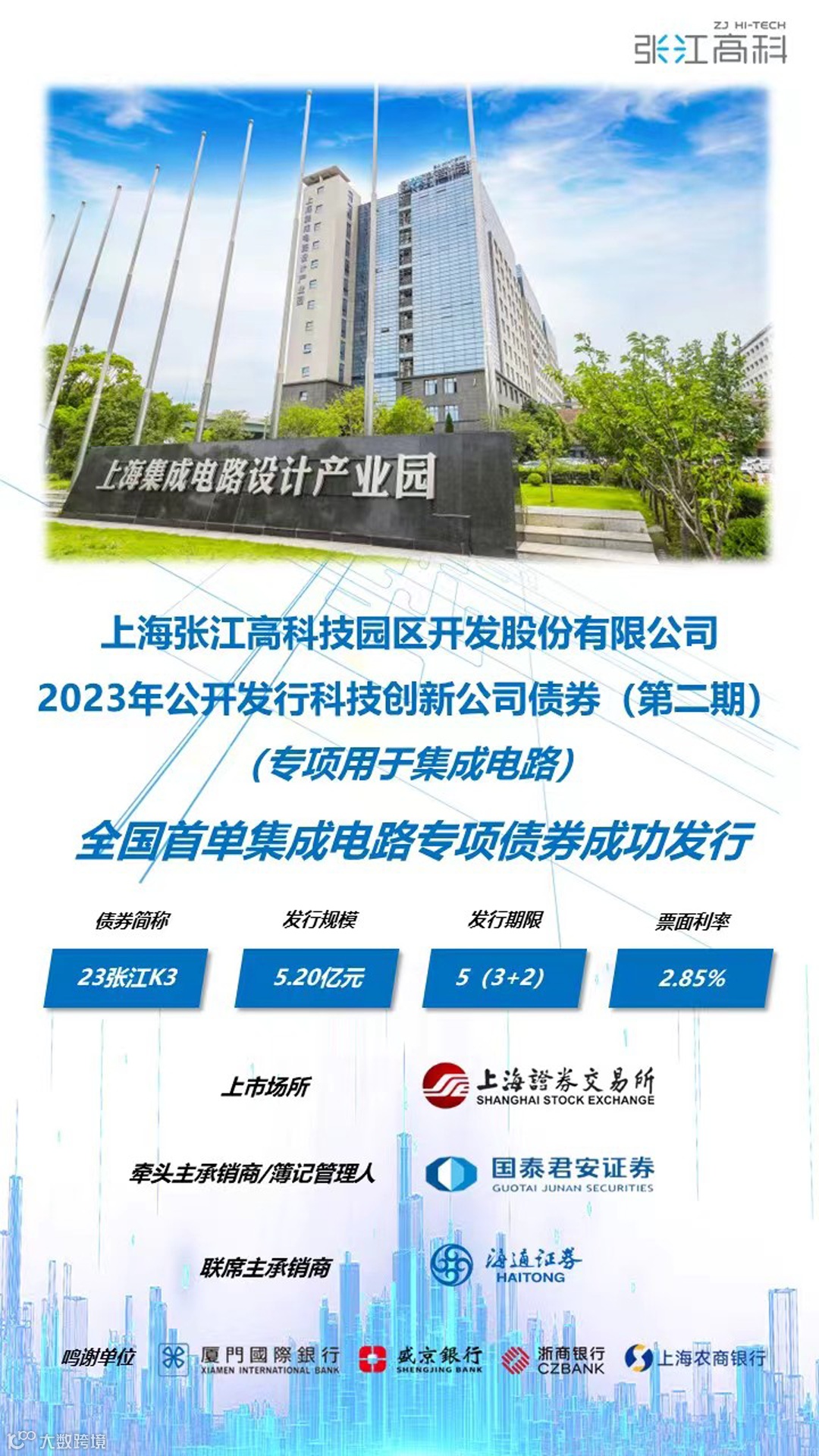 近日,海通证券作为主承销商,助力上海张江高科技园区开发股份有限公司(以下简称张江高科)成功发行全国首单集成电路专项科技创新公司债券——23张江K3。