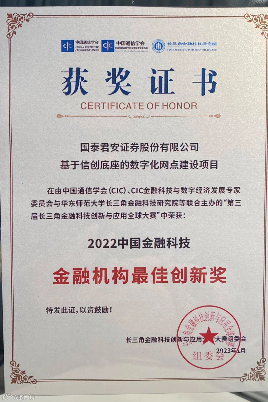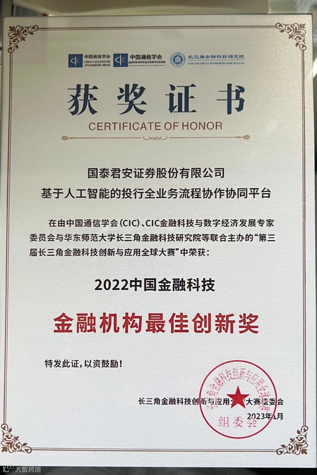 本次大赛由中国通信学会(CIC)、CIC金融科技与数字经济发展专家委员会、上海金融业联合会、上海市银行同业公会和华东师范大学全程指导,由华东师范大学长三角金融科技研究院牵头联合上海黄浦区金融办、普陀区金融办、浙江大学金融科技研究院、苏州市金融科技协会、南京江东商贸区管委会共同主办。大赛历时6个多月,共收到457个项目报名,评选出高度符合大赛应用场景指引的项目165个,优质入围项目111个。根据专家们一致意见,国泰君安首席信息官俞枫荣获2022年度金融科技管理领军人物卓越奖,成为证券公司唯一获此殊荣的领导;公司“基于信创底座的数字化网点建设”、“基于人工智能的投行全业务流程协作协同平台”项目从众多项目中脱颖而出,荣获金融机构最佳创新奖,获奖数量位列行业第一。