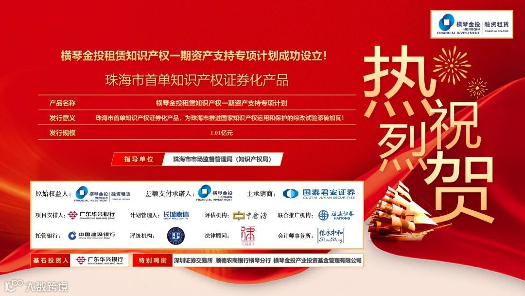 国泰君安坚持“高站位、高起点、高标准”,积极服务粤港澳大湾区建设。横琴金投租赁作为珠海市属国有融资租赁公司,业务高度聚焦横琴产业发展、大湾区区域项目以及粤港澳合作,深度融入大湾区战略及琴澳共建,是国泰君安重要的优质客户。今年7月,国泰君安助力横琴金投租赁成功获批20亿元储架式资产支持专项计划,并于8月圆满完成储架下首期发行工作,广受资本市场投资者认可。在双方彼此信任和精诚合作下,国泰君安全面助力横琴金投租赁探索创新融资租赁资产证券化的业务模式,成功发行本期珠海市首单知识产权ABS产品。