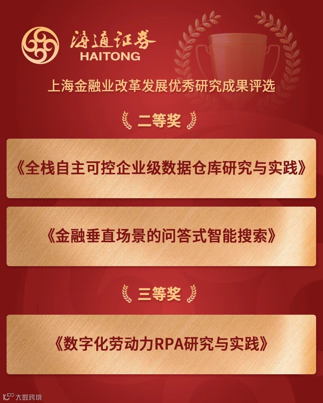近日,由上海金融业联合会主办的“2020-2021年上海金融业改革发展优秀研究成果评选”结果揭晓。海通证券《全栈自主可控企业级数据仓库研究与实践》《金融垂直场景的问答式智能搜索》荣获二等奖,《数字化劳动力RPA研究与实践》荣获三等奖。