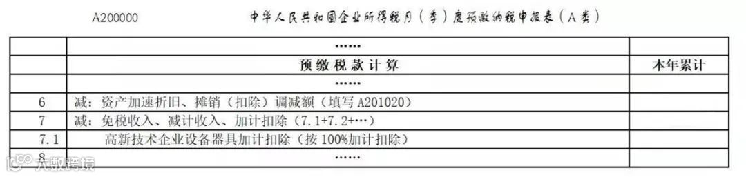 第二步,填报加计扣除情况。在《中华人民共和国企业所得税月(季)度预缴纳税申报表(A类)》(A200000)第7行“减:免税收入、减计收入、加计扣除”下的明细行次中,填写“高新技术企业设备、器具加计扣除(按100%加计扣除)”事项及加计扣除金额。表单节选部分填报如下: