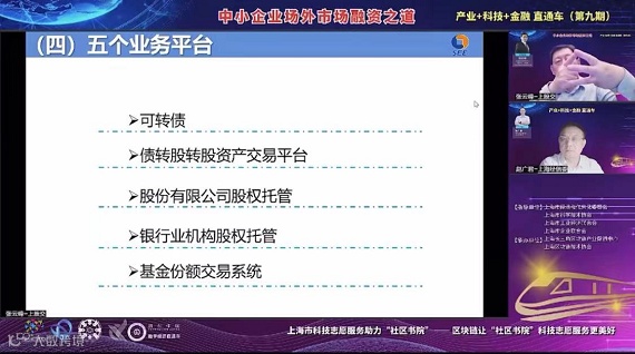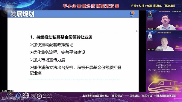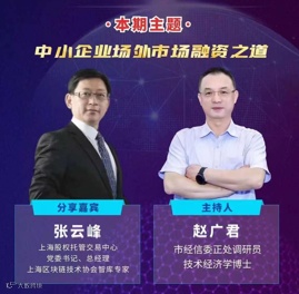 7月31日,上海股交中心党委书记、总经理张云峰受邀作为“产业+科技+金融”直通车(第九期)主讲嘉宾,开展了主题为《中小企业场外市场融资之道》的主题讲座。“产业+科技+金融”直通车系列活动是由上海市经济和信息化委员会、上海市科学技术协会和上海市企业联合会联合指导,以及上海市长三角区块链产业促进中心、上海区块链技术协会承办。活动由上海市经信委正处调研员技术经济学博士赵广君主持。
