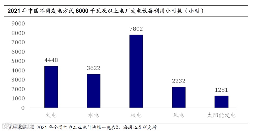 高利用小时:核能发电不受天气、季节或其他环境因素的影响,根据《2021年全国电力工业统计快报一览表》,2021年中国6000千瓦及以上核电厂发电设备利用小时达到7802小时,远超新能源。