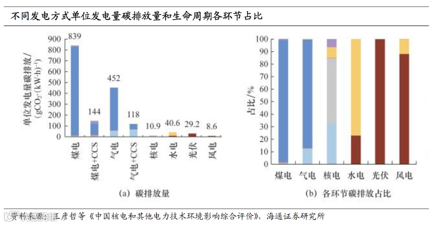 根据《中国核电和其他电力技术环境影响综合评价》,核电生命周期单位发电量碳排放仅为10.9 gCO2/(kW·h),远低于煤电、气电、水电、光伏等其他发电方式。核电发电二氧化碳排放主要来自燃料开采和废弃处理环节。
