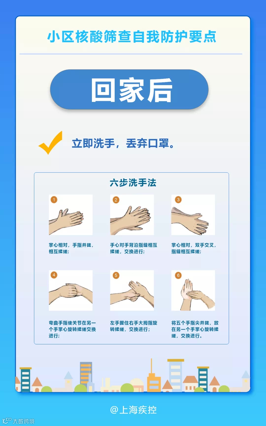 核酸筛查期间,采样频次增加。参加核酸检测时,如何做好自我防护?一起来看排队时、采样时、检测完、回家后的防护要点↓
