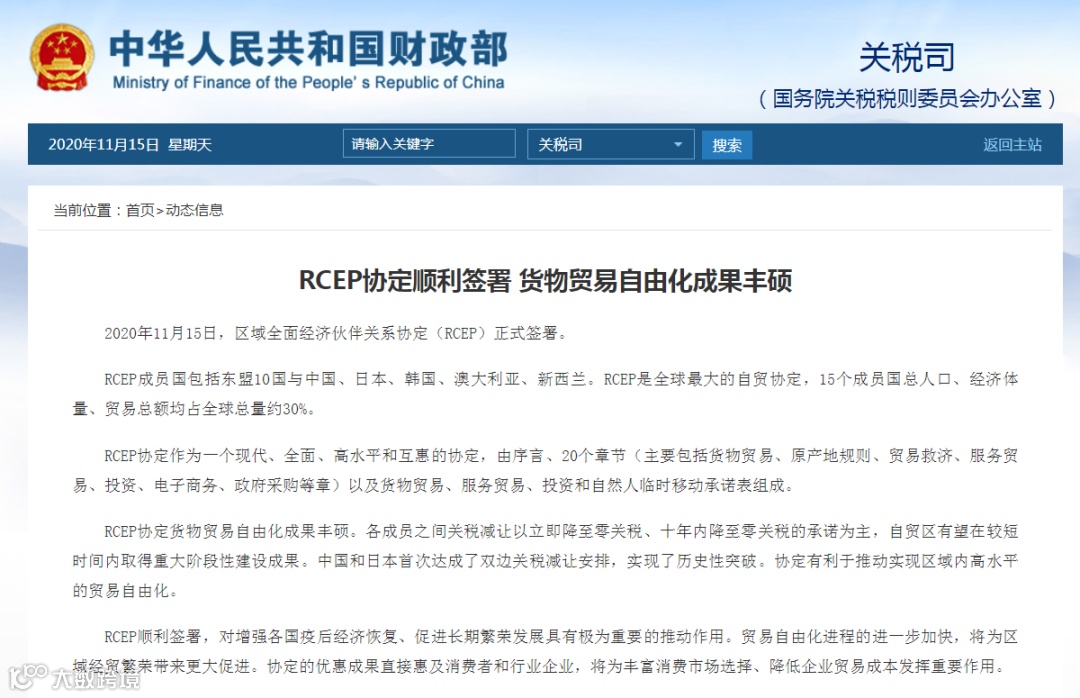 财政部网站消息,11月15日,区域全面经济伙伴关系协定(RCEP)正式签署。