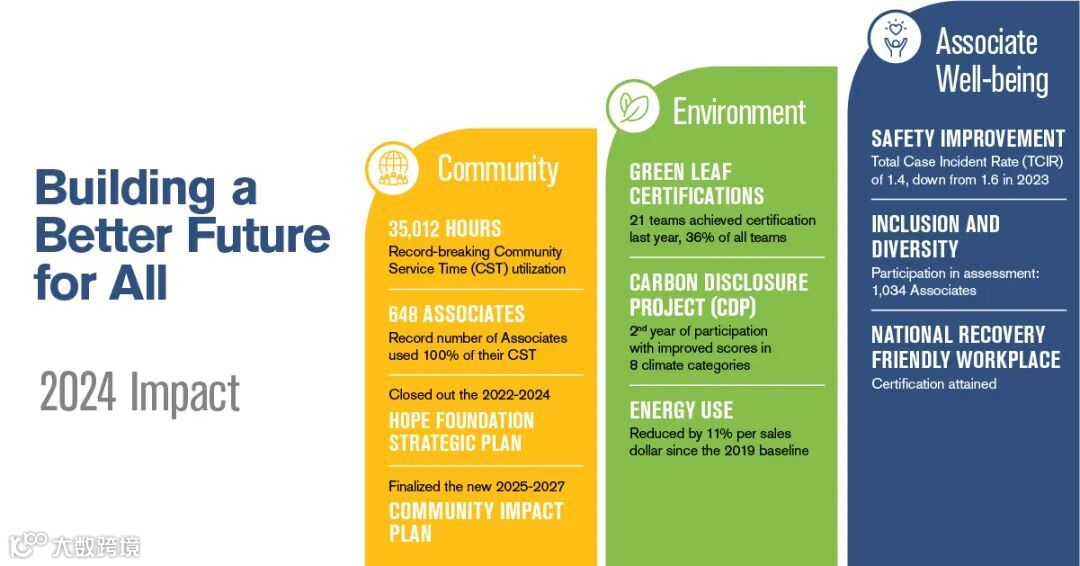 鉴于在“三重底线”(Triple Bottom Line)目标上取得的显著进展,公司高管团队及董事会已将相关优先事项纳入长期规划和年度运营计划,设定了具体的衡量指标和目标,涵盖:社区服务时间利用、团队参与“绿叶”(Green Leaf)认证计划、2030年可持续发展目标进展、工伤风险降低、员工敬业度与归属感、员工学习时长以及持续改善项目完成情况等。