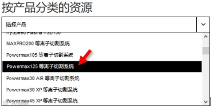 在页面下方的“按产品分类的资源” 下拉框中,选择 “Powermax125 等离子切割系统”选项。