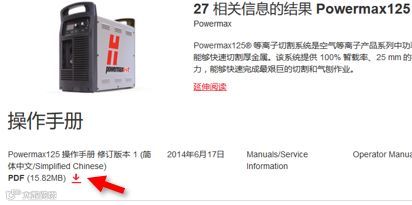 进入搜索结果页面后,点击 “Powermax125操作手册” 文件名称下方的红色下载箭头,下载该文件。