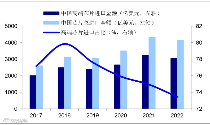 二是目前以半导体为代表的硬科技制造领域国产化率仍较低,国产替代空间广阔。根据SIA数据,2022年中国半导体消费占全球的31%,但2022年中国半导体企业的市场份额仅为7%,尤其是高端芯片领域,中国对海外依存度较高,2022年中国高端芯片进口占芯片进口整体比重高达73%。