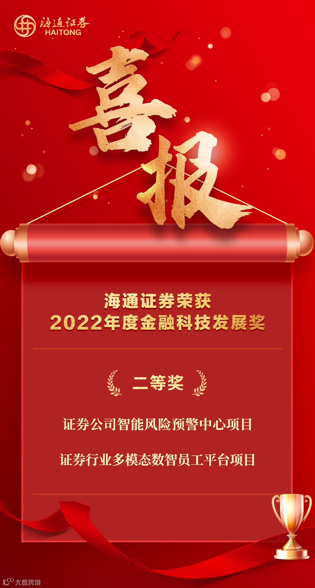 近日,中国人民银行公示“2022年度金融科技发展奖”。根据评审流程,通过对484个申报项目的初评、复评、金融科技发展奖评审领导小组会议审定,评选出193个获奖项目。其中,海通证券申报的“证券公司智能风险预警中心”“证券行业多模态数智员工平台”两个项目荣获“金融科技发展奖”二等奖。