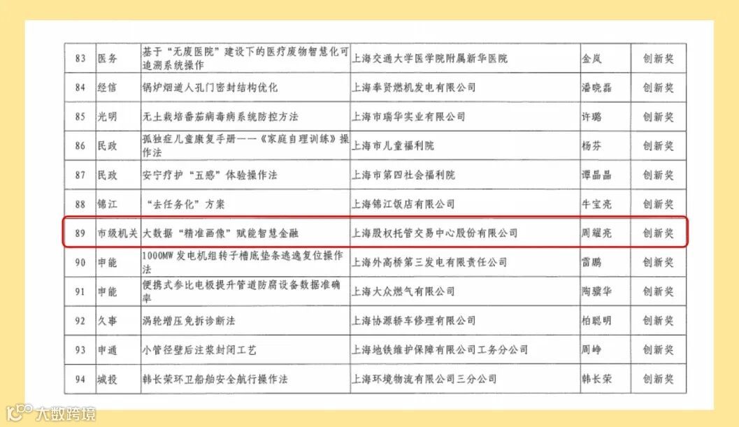 为深入学习贯彻党的二十大精神和中国工会十八大精神,紧紧围绕推动发展新质生产力的新部署新要求,进一步激发广大职工创新创造活力,培养更多高素质技术技能人才,市总工会、市科委和市经信委联合发起了“上海市职工合理化建议和先进操作法优秀成果征集命名”活动。在这次活动中,由上海交易集团工会推荐、上海股交中心工会组织申报的“上海股交中心大数据‘精准画像’赋能智慧金融的创新应用”项目,获评“2024年上海市职工先进操作法创新奖”。