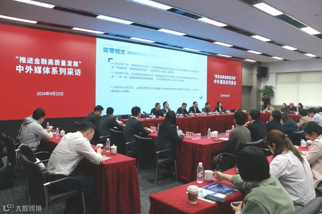 4月25日下午,由市委外宣办,市委金融办、市金融工作党委联合主办的“推动金融高质量发展”中外媒体系列采访活动(科技金融专场)在上海股交中心举行。中共上海市委外宣办、市政府新闻办对外宣传处处长、二级巡视员沈良主持会议。市委金融办、市金融工作党委,市政府新闻办有关负责同志出席活动。上海股交中心党委委员、副总经理陈妍妍、上海科创基金行政总裁康鸣分别就本单位在做好科技金融大文章方面的创新举措与发展成效作介绍,并接受了新华社、人民日报、解放日报、彭博社、香港商报等26家中外媒体的集体采访。