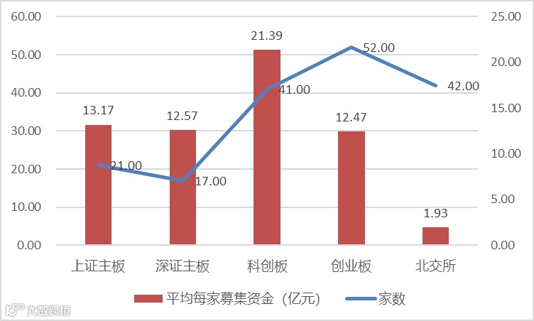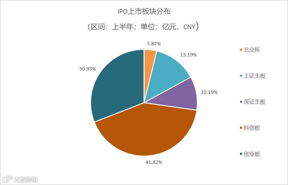 从上市板块来看, 2023年上半年国内A股IPO市场融资金额最多的是科创板,募集资金金额876.79亿元,融资家数41家,平均募集资金金额21.39亿元。2023年上半年国内A股IPO市场融资家数最多的是创业板,融资家数52家,募集资金金额648.44亿元,平均募集资金金额12.47亿元。北交所IPO总额为81.21亿元,IPO公司数量达42排第二,中小企业服务成效初显。科创板与创业板融资总额与上市公司数量两项指标大于两大主板市场之和。
