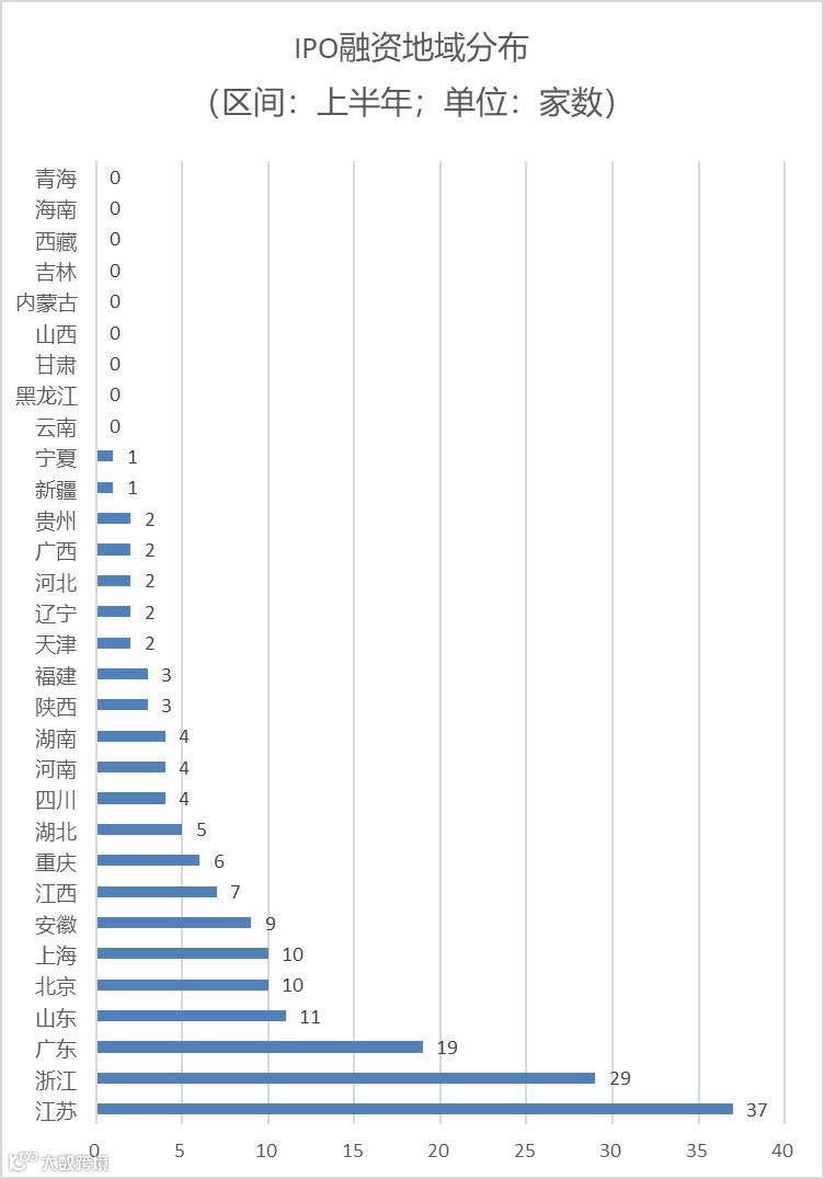 根据IPO的地域分布,2023年上半年IPO公司主要集中于长三江区(江苏、浙江、上海)、广东、山东以及北京。IPO总计173家,前三的地区为江苏37家、浙江29家、广东19家。