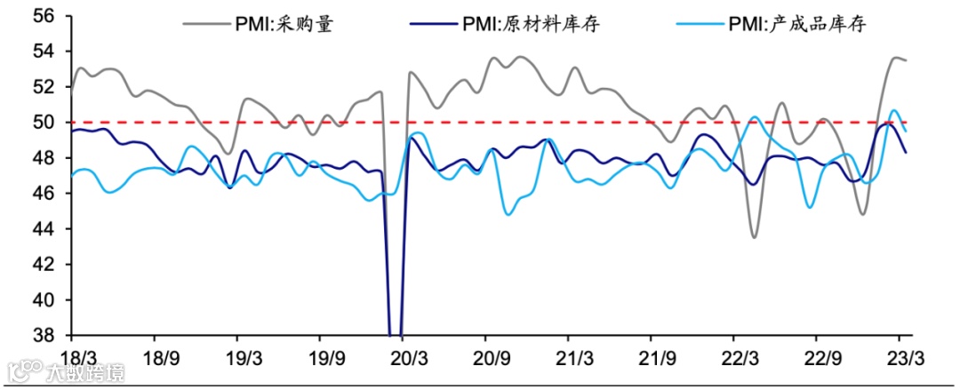 价格指数回落,采购活跃,库存去化。3月主要原材料购进价格指数、出厂价格指数回落。3月供货商配送时间指数有所回落,但仍处于较高水平,反映物流仍较为通畅,这也使得企业采购活动比较活跃。3月采购量指数持平于上月的53.5%,继续高位运行。供需扩张,但是生产慢于需求,使得企业库存去化。3月原材料库存、产成品库存指数低于上个月。