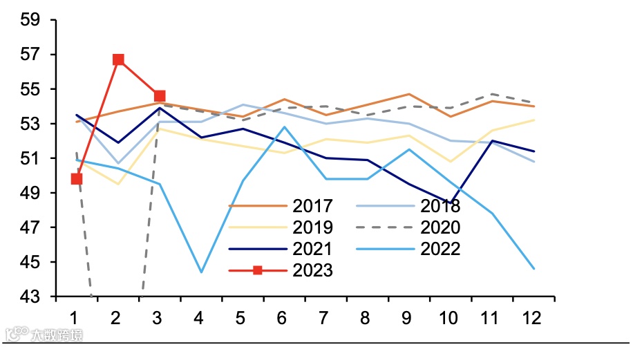 制造业PMI回落,仍处于高位。2023年3月,制造业采购经理指数(PMI)为51.9%,比上月下降0.7个百分点。目前制造业PMI仍处于扩张区间,且位于较高位置,反映经济复苏仍在继续。值得关注的是,往年步入春节后的3月,随着复工复产的加快,制造业PMI一般季节性回升,但目前的PMI逆季节性回落,除上个月基数较高的因素,也反映经济恢复基础仍不稳固。从主要分项指标看,3月新订单、生产、从业人员、原材料库存指数均有所回落。分行业看,本月PMI最高的4个行业为饮料、通用、服装、计算机,环比最好的3个行业为计算机、木材、饮料。从企业规模看,大型企业PMI基本持平于前一个月,中、小型企业PMI回落。