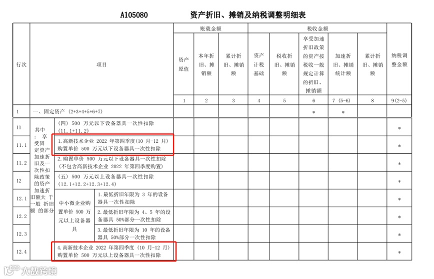 购置设备、器具税前一次性扣除在A105080资产折旧、摊销及纳税调整明细表相关行次填报。购置设备、器具100%加计扣除在A107010免税、减计收入及加计扣除优惠明细表相关行次填报。