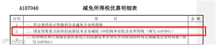 A107041高新技术企业优惠情况及明细表填写完整数据(无论盈亏都需要填写)→A107040减免所得税优惠明细表内关联并自动生成高新技术企业减按15%税率征收企业所得税金额