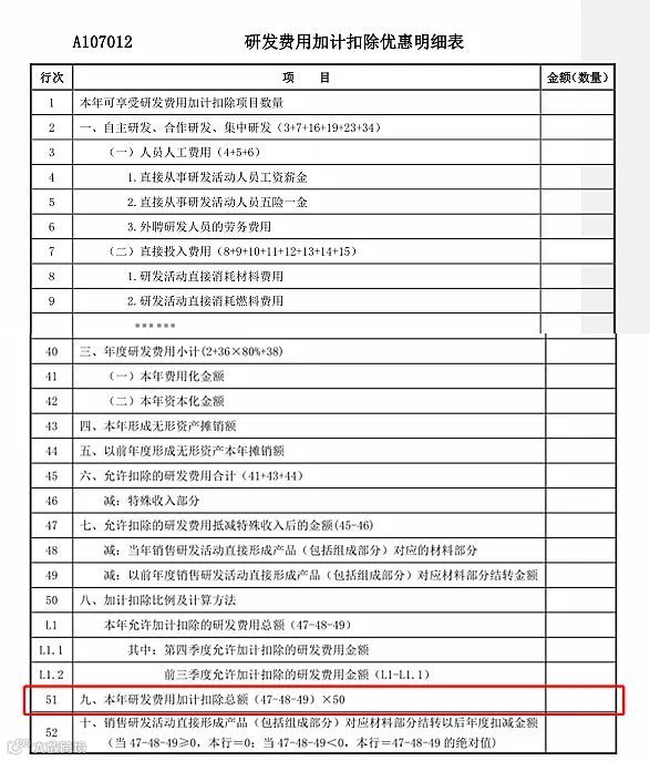 A107012研发费用加计扣除优惠明细表填写相关数据→A107010免税、减计收入及加计扣除优惠明细表内关联并自动生成研发费用加计扣除优惠金额