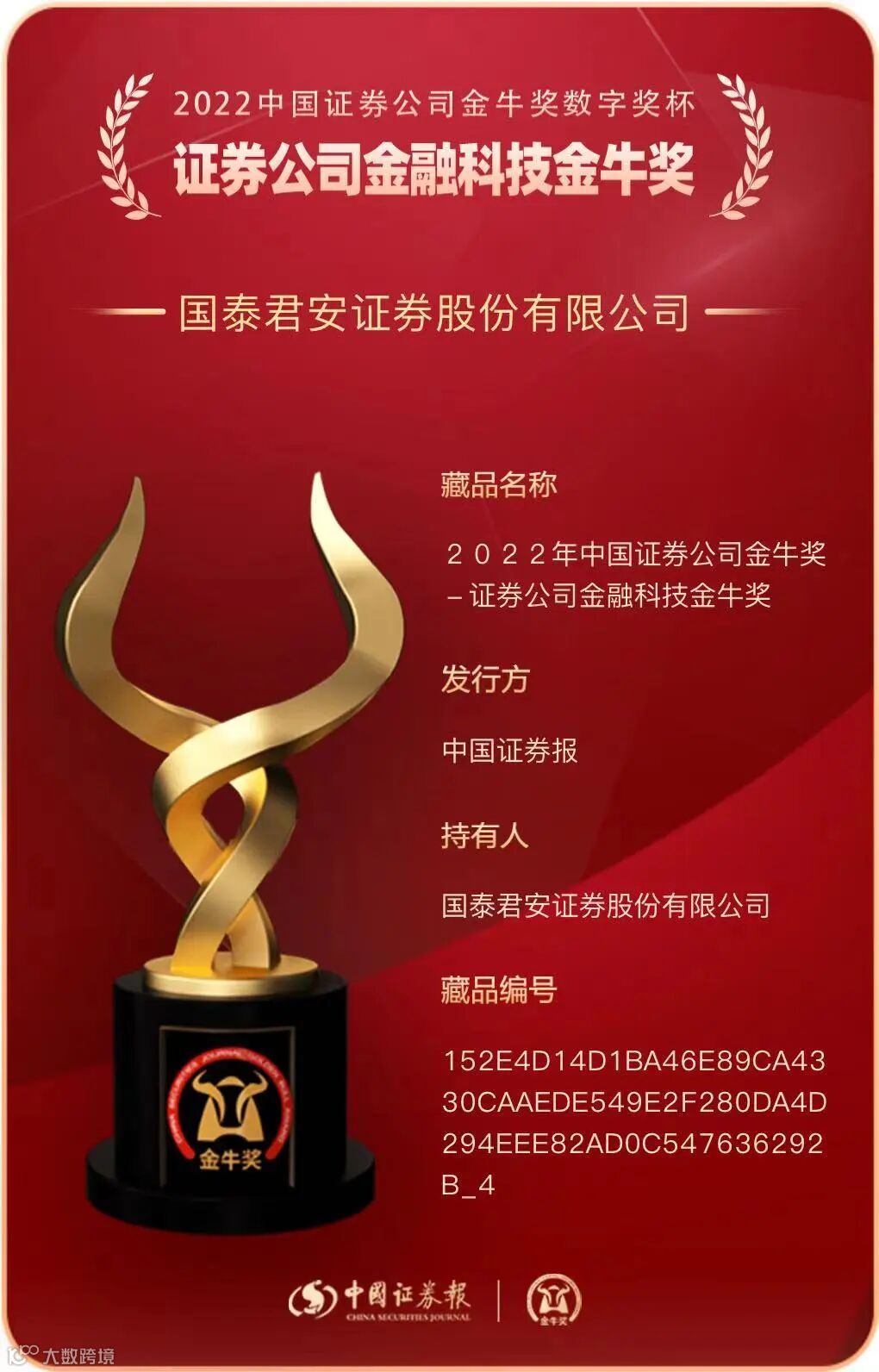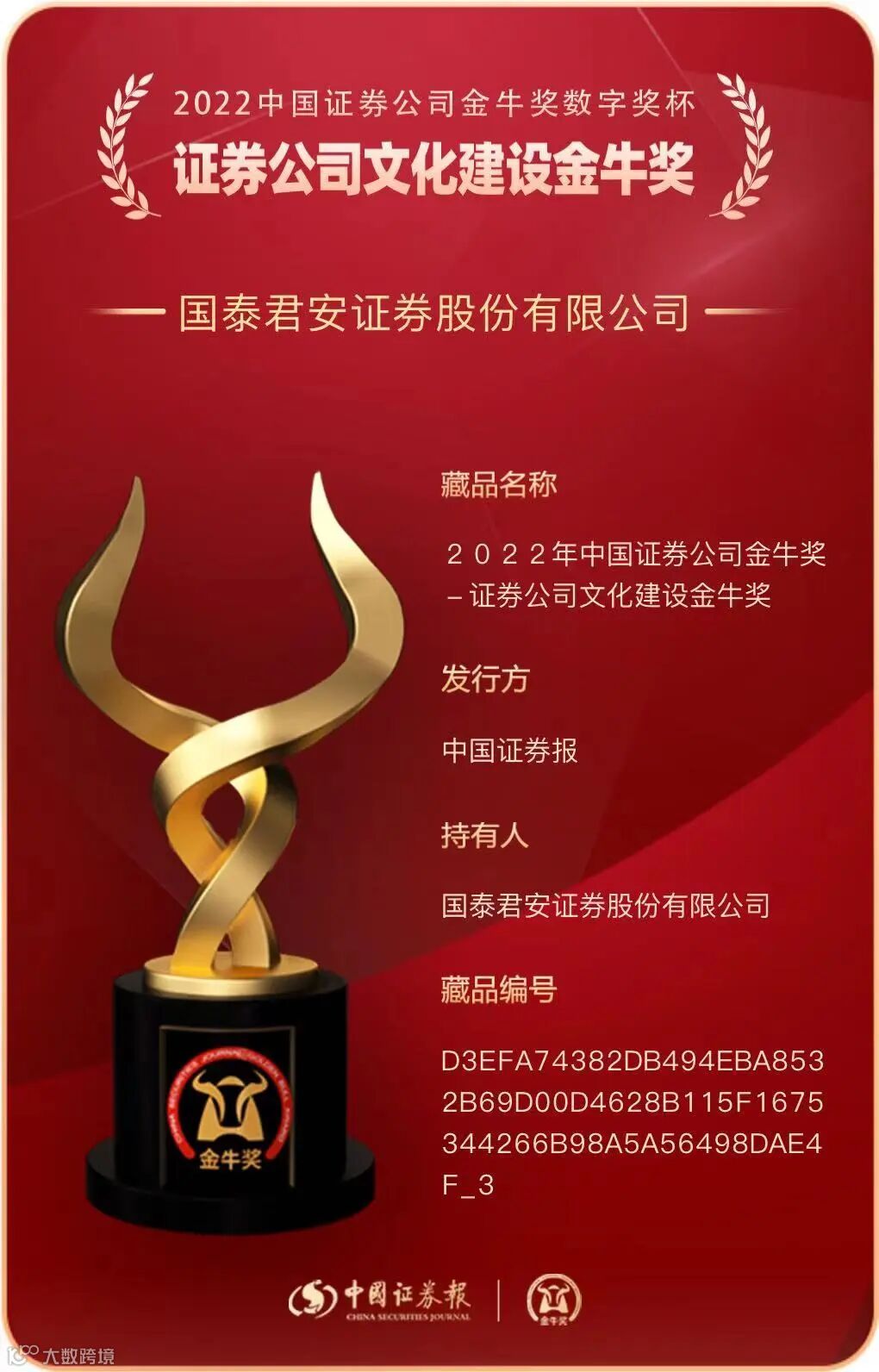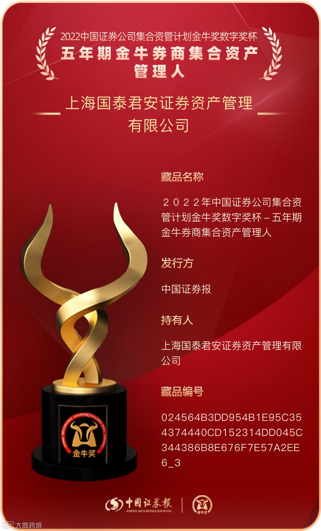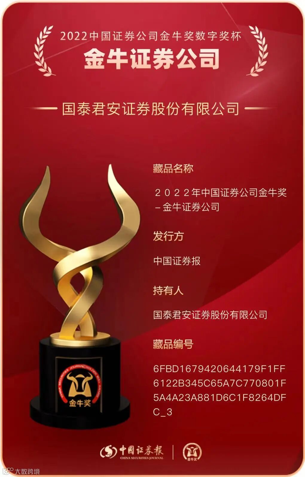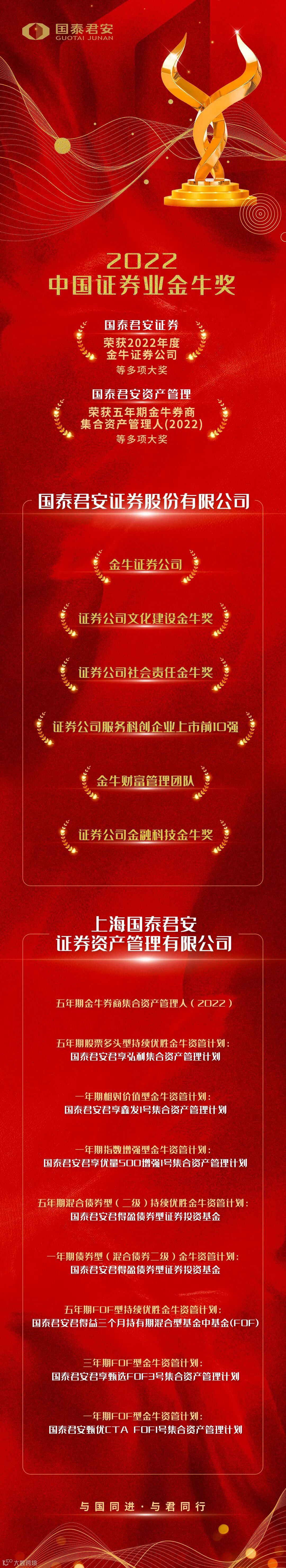 12月24日,由中国证券报社主办的“2022中国证券业高质量发展论坛暨2022中国证券业金牛奖颁奖典礼”在辽宁沈阳举行。国泰君安凭借卓越的市场表现,再度荣膺“金牛证券公司”年度奖项,并同时斩获“证券公司文化建设金牛奖”、“证券公司社会责任金牛奖”、“证券公司服务科创企业上市前10强”、“金牛财富管理团队”、“证券公司金融科技金牛奖”共计6项大奖,国泰君安资产管理荣获“五年期金牛券商集合资产管理人(2022)”等多项大奖。
