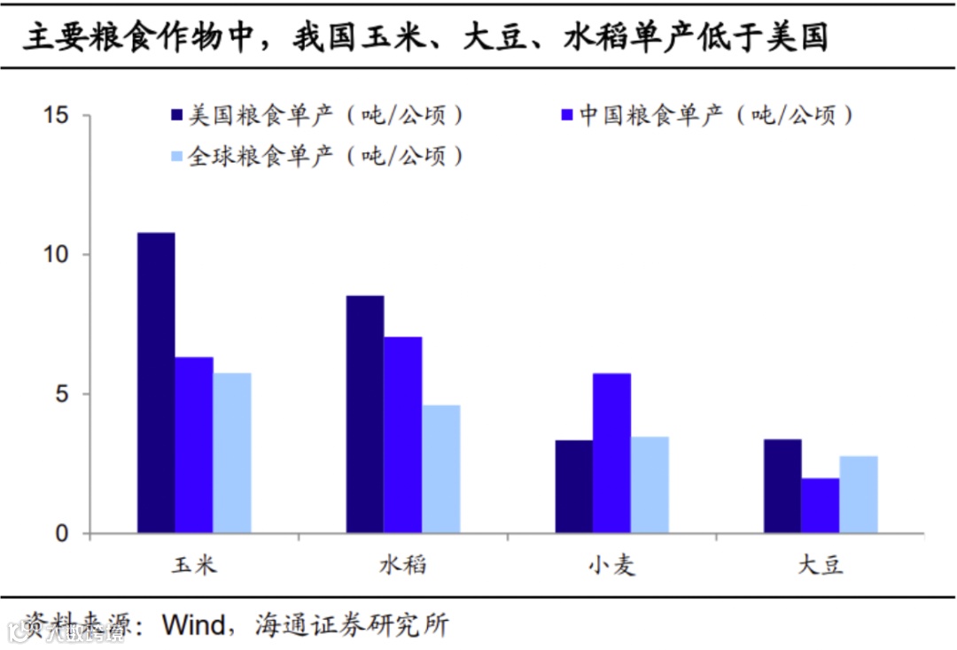 我国粮食安全仍存隐忧,种源安全部分受制于海外。我国是世界第一大粮食生产国,但玉米、水稻、大豆单产均低于美国,且大豆自给率较低。当前粮食的战略性属性强化,而疫情、俄乌冲突加剧了全球粮食贸易格局的扭曲。国内来看,我国粮食供需层面还存在多重结构性矛盾,且我国种子品质相对较低,加强种业自主可控是确保粮食安全的重点。
