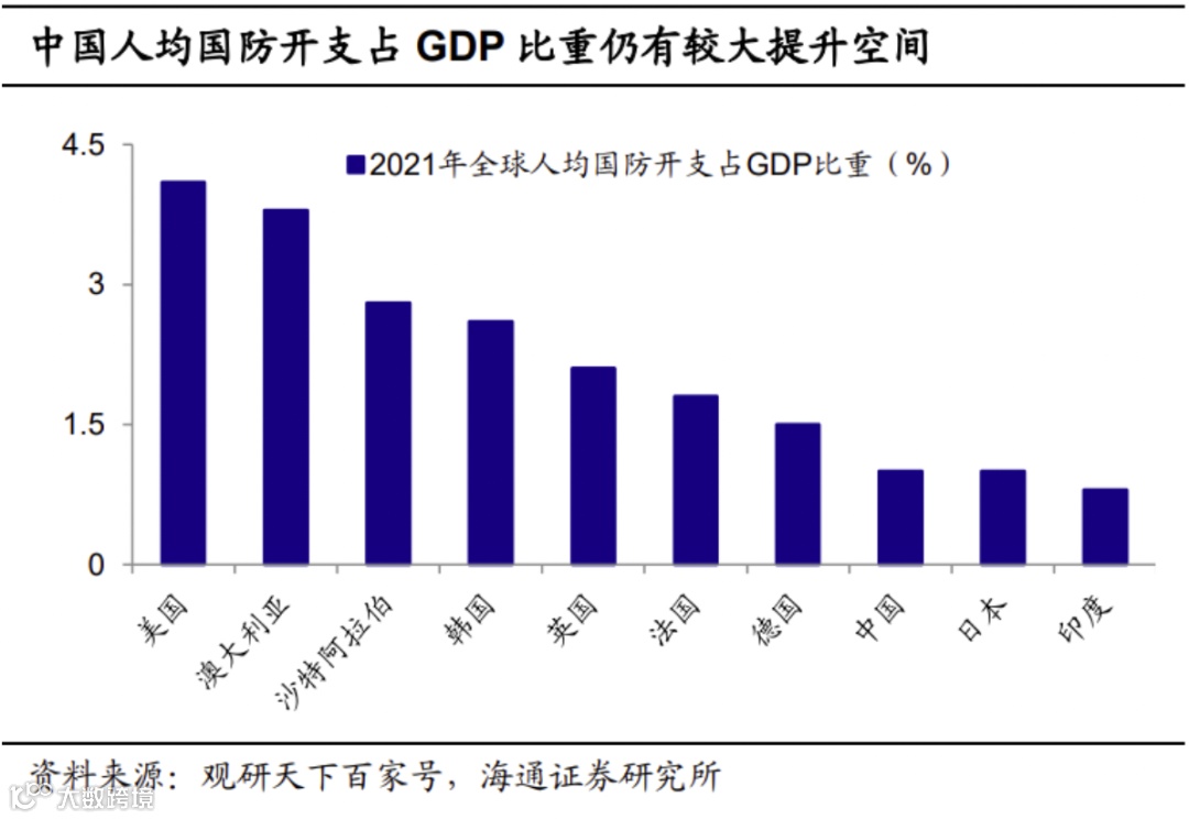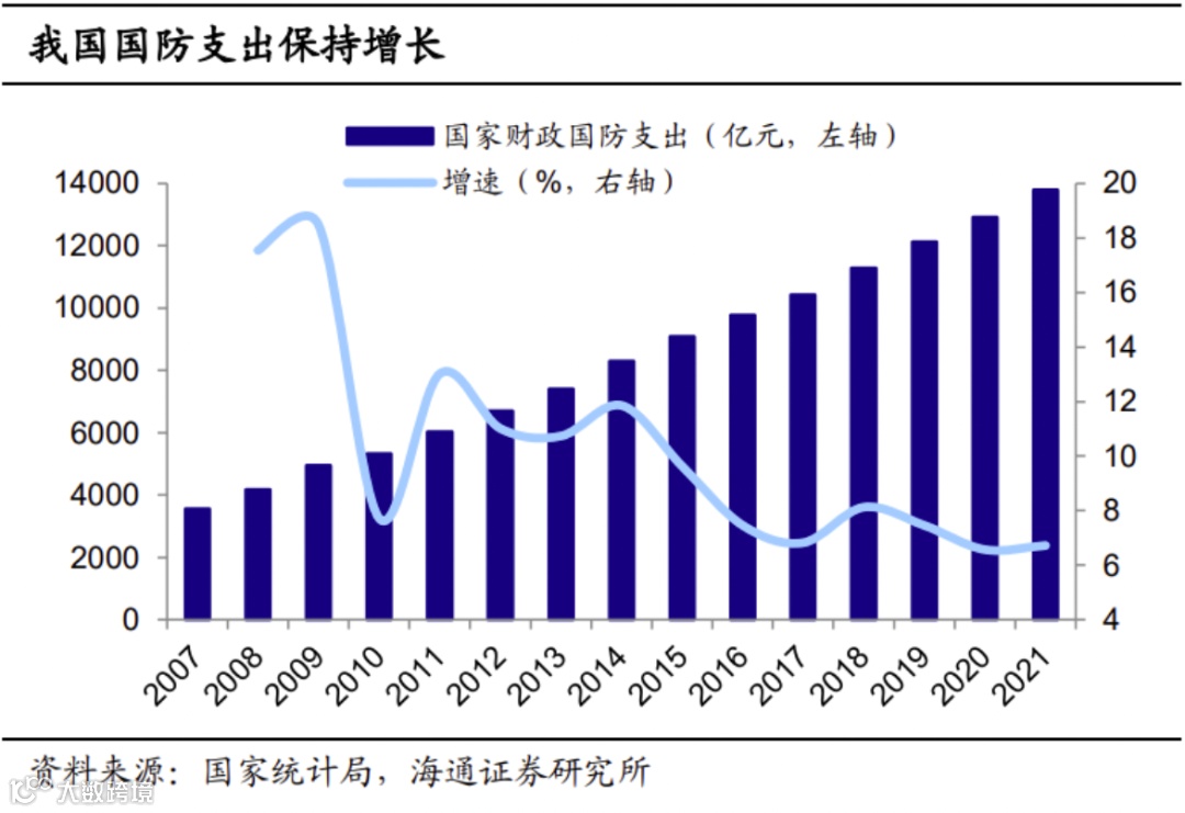 保持军费支出稳定增长,是保障国家安全的基础。我国军用装备需求和军费支出将保持适度稳定增长。同时,随着战争形态加速演变,建设智能化军事体系对武器装备的性能提出更高要求。目前我国高端装备制造行业在部分领域仍受到海外压制,急需推进国产替代化进程,如航空发动机等领域。