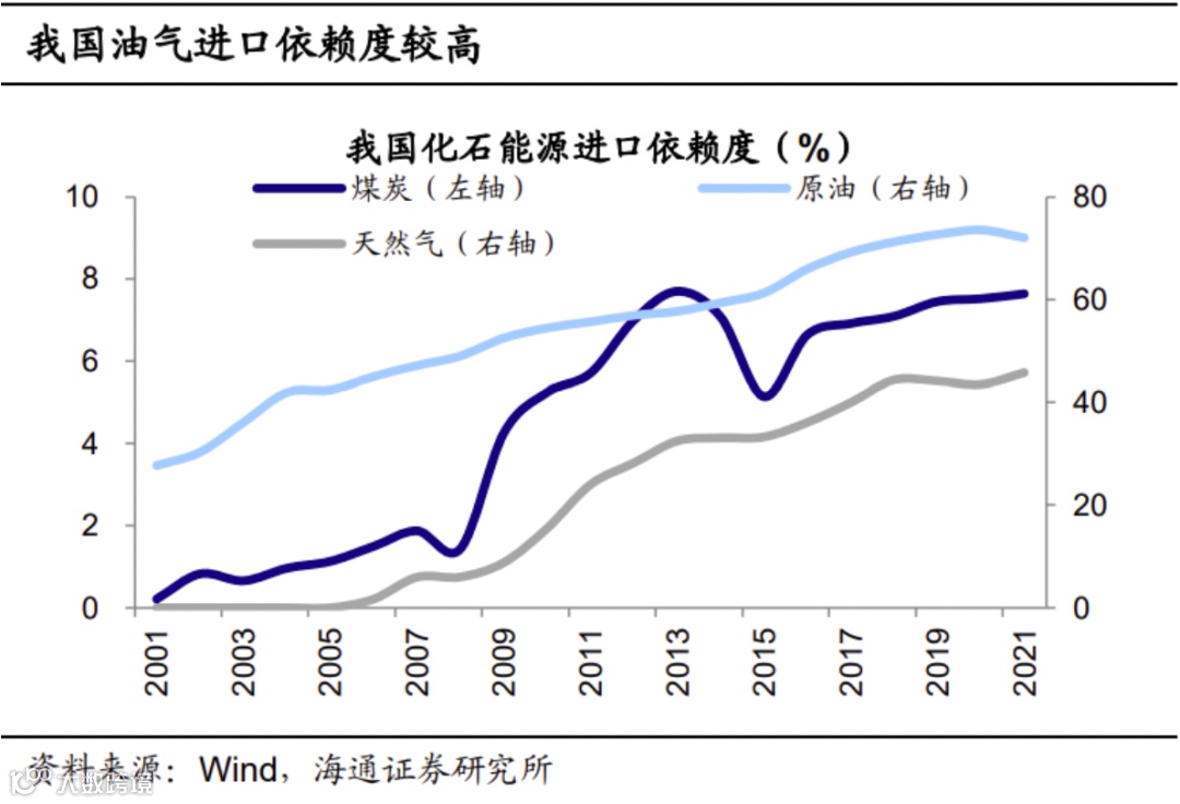 确保能源安全的关键在于加快新能源对传统能源的替代。我国富煤、贫油、少气,煤炭开采难度大、成本高,原油和天然气进口依赖度也不断提升。在当前全球地缘政治紧张的背景下,油气资源的对外依存度带来的供应不确定性加剧,加快新能源的发展和应用,将是实现能源领域自主可控的重点。