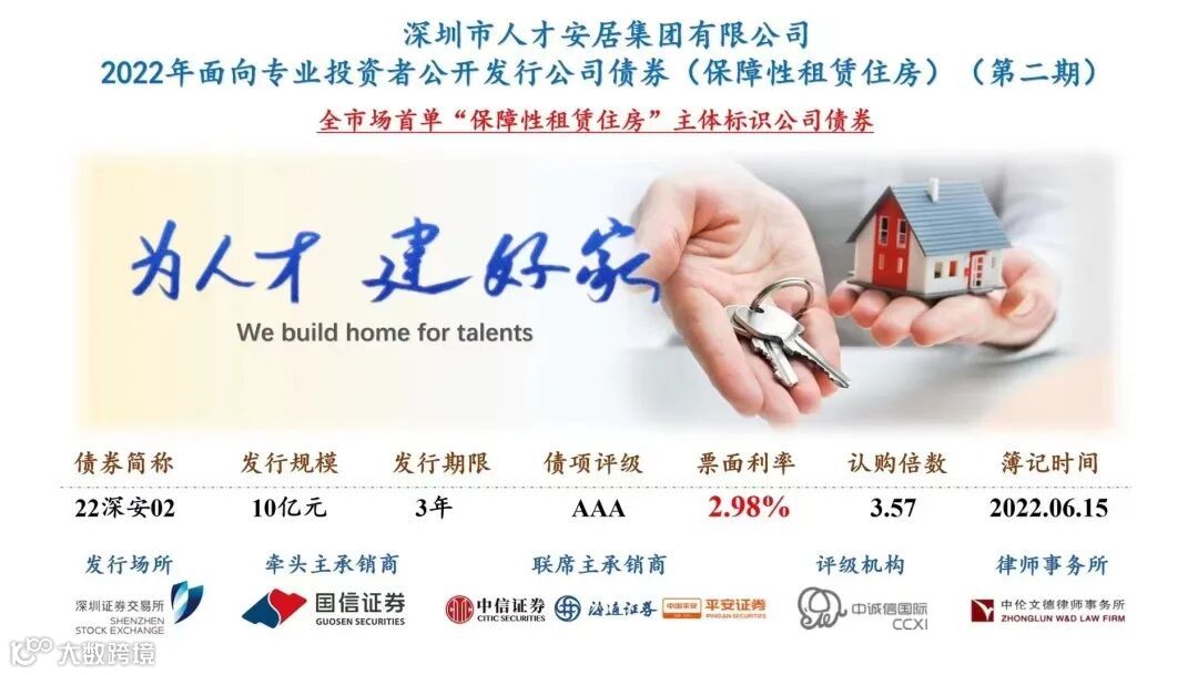 6月15日,由海通证券主承销的全市场首单“保障性租赁住房”主体标识公司债券——深圳市人才安居集团有限公司(以下简称人才安居集团)2022年面向专业投资者公开发行公司债券(第二期)完成簿记,发行规模10亿元,期限3年,票面利率2.98%。
