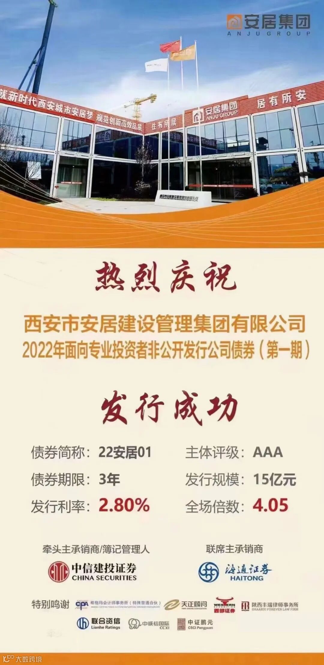 5月30日,海通证券助力西安市安居建设管理集团有限公司(以下简称西安安居集团)成功发行3年期15亿元非公开公司债券。这是西安安居集团在获取国内最高信用等级AAA评级后,首次亮相资本市场,投资者资金认购倍数超过4倍。