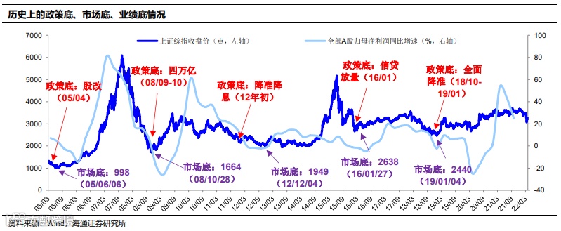 历史数据显示,政策底到业绩底是复杂筑底过程,市场底并不一定高于或者低于政策底,但是着眼长期,如果从历史上政策底出现的时间开始布局,最终都会取得较好的收益。这一次的政策底其实是2021年12月的中央经济工作会议,业绩底需等待政策效果出现,目前市场处在底部区域,是布局的时期。