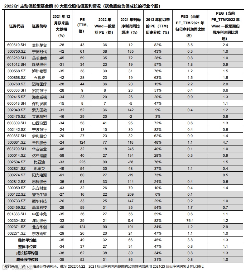 回顾2010年以来历次A股大盘企稳见底阶段市场结构特征,可以发现高股息类股票率先横盘企稳,随后指数见底,基金重仓股在指数见底前后跌幅更大。就本轮的盘面特征而言,高股息个股在2021年8月已经见底,随后开始震荡上行。指数层面上,沪深300指数于今年3月中旬达到阶段性低点,创业板指目前已创新低。基金重仓股方面,我们在主动偏股型基金重仓股中挑选了前三十大重仓股,这三十大个股占了基金整体持股规模的40%。从调整幅度来看,自2021年12月指数高点以来(截至2022/04/22,下同)沪深300最大跌幅为23%,同期2022Q1基金前三十大重仓股最大跌幅的均值为35%、中位数34%,基金重仓股的跌幅明显更深。