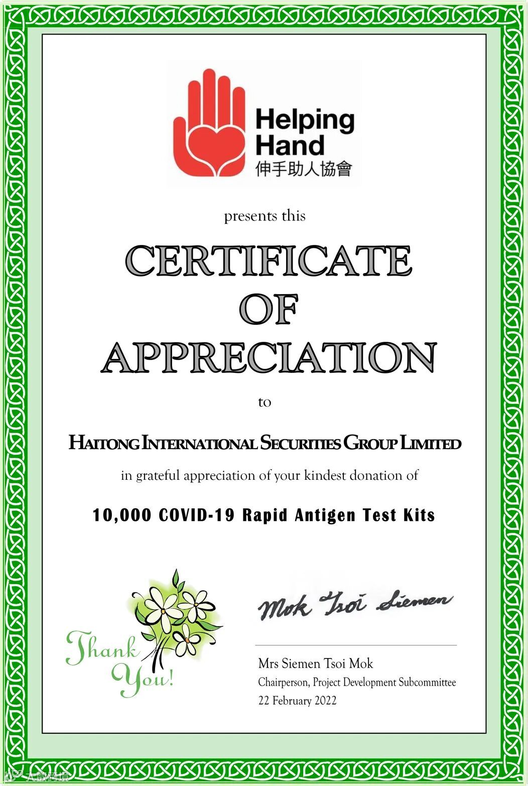 此外,海通国际延续一直以来对香港年长群体的关注,捐赠1万套新冠抗原检测试剂盒给长期合作的公益伙伴“伸手助人协会”,为长者提供支援,为抗疫尽一份绵薄之力。