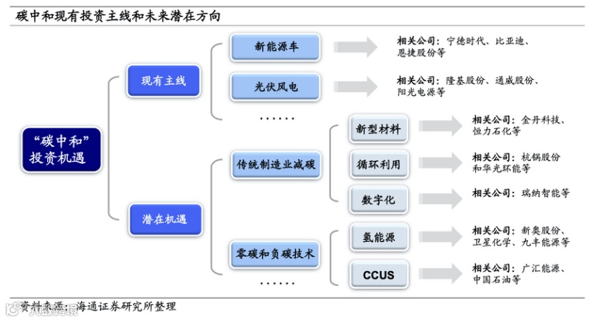 综上所述,自2020年9月“双碳”目标提出以来,以新能源车、光伏风电为代表的投资主线表现较强。展望未来,我们认为碳中和潜在的投资机遇依然很多,可以从传统制造业技术改造与零碳和负碳技术两个大方向挖掘,可以用一张图来总结和展示:
