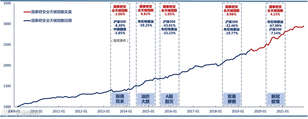 特别的,对于历史上的各类资产出现系统性市场冲击的时候,国泰君安全天候指数内部的资产轮动都较好的规避了压力资产,体现出模型算法的科学性和前瞻性,如2013年流动性恐慌时,债券大幅下跌,指数资产组合中债券为空仓;2014年下半年开始油价大屠杀和 2020年新冠疫情中,指数资产组合中原油空仓;2015年06月12日A股股灾和2018年中美贸易战时,指数资产组合中权益保持空仓。受疫情冲击下的2020年,国泰君安全天候指数年化收益率达到13.79%,最大回撤-2.61%,夏普比率达到2.73。特别是在权益市场明显调整的2-3月,均贡献了正收益。